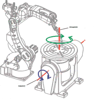 Круговая синхронизация позволяет роботу согласовывать свои движения с движениями внешних дополнительных осей вращения. Робот способен совершать синхронные движения совместно с позиционером, имеющим одну или более осей вращения. Это позволяет роботу выполнять полный охват даже очень больших деталей с возможностью выбора для себя наиболее удобной точки подхода и положения сварного соединения в пространстве. Данная технология позволяет совершать операции, где требуется выполнить сплошной шов на изделии со сложной геометрией без перепозиционирования робота в процессе сварки.