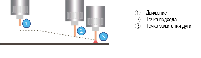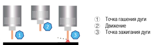 В обычном режиме поджиг дуги производится следующим образом. Сначала происходит позиционирование робота в начальной точке сварки, затем начинается предварительная подача газа и подача проволоки. Дуга зажигается в момент касания проволоки свариваемой детали. За счет того, что подача проволоки в момент запуска сварки происходит достаточно медленно, мы имеем значительную временную паузу между позиционированием робота и поджигом дуги. Когда функция горячего старта активна, робот начинает подачу проволоки для поджига дуги заранее, в точке подхода к месту сварки. Это позволяет сделать поджиг в точке старта сварки практически мгновенным и значительно сократить общее время цикла сварки изделия.
