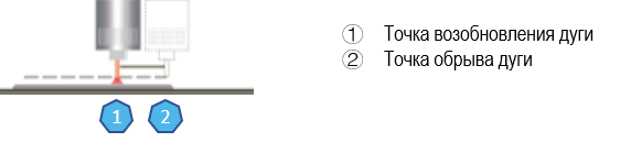 Если в процессе сварки происходит обрыв дуги, робот запомнит данную точку, после проверки оператором причин обрыва и их устранения робот запустит программу с той же строки, и продолжит процесс сварки с того же места. Точка разрыва дуги будет удалена после сброса программы или возобновления процесса сварки.
