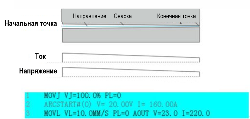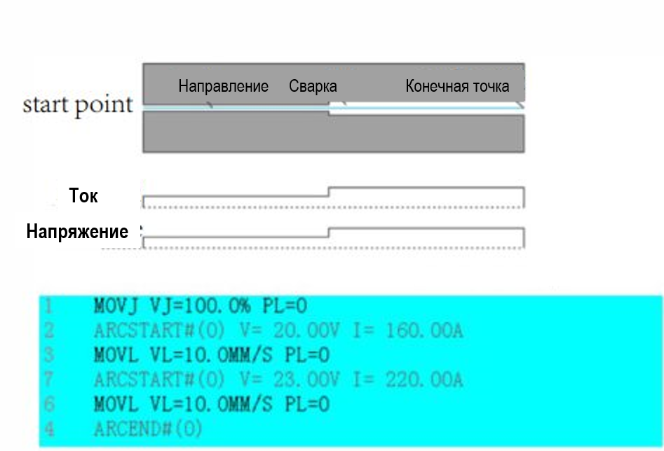 Сварочные инструкции поддерживают корректировку сварочного тока и напряжения непосредственно в сварочной программе. Это позволяет удобно регулировать сварочные параметры прямо в процессе написания программ.